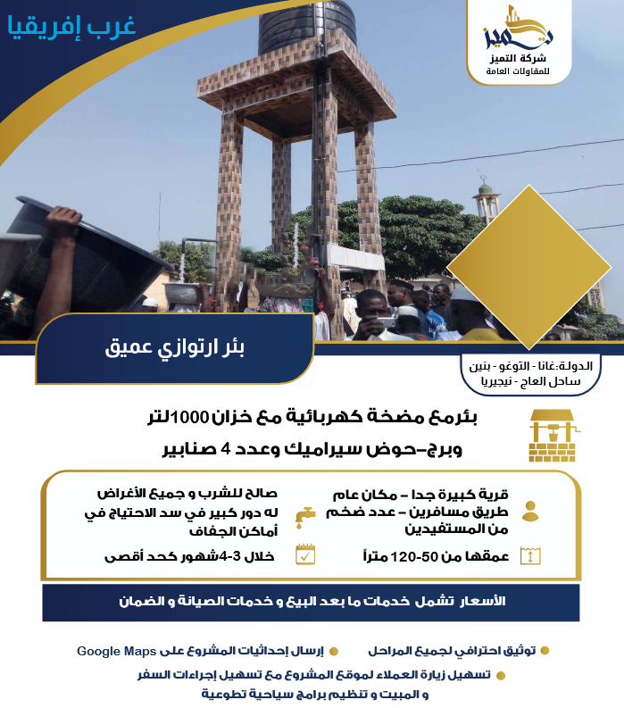 بئر ارتوازي عميق مع مضخة كهربائية – مع خزان 1000 لتر وبرج – حوض سيراميك و عدد 4 صنابير